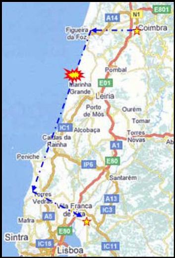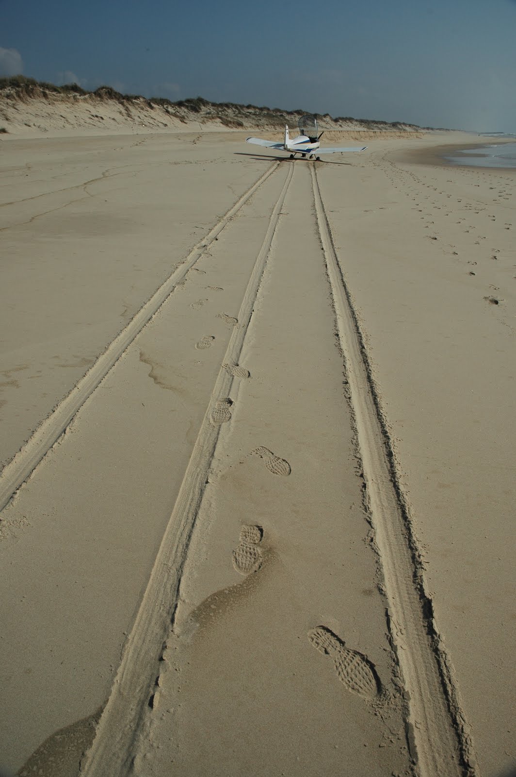 Embora não sejam fotografias aéreas, eis a primeira (e esperemos que a última) Aterragem Forçada do autor deste blogue, na tarde do dia 18 de Junho de 2010. A aterragem em si, próxima da Praia da Vieira, na Praia do Vigão, foi tecnicamente fácil e muito suave. O motor começou subitamente a vibrar fortemente e perdeu grande parte da sua potência, obrigando o piloto a esta decisão extrema, pois já não possuia altitude suficiente para alcançar um aeródromo. Os problemas surgiram depois, com a exigente burocracia que rege os meios aéreos e a complicada operação logística para o resgate da aeronave. Foi rebocada por um tractor ao longo de 4 kms até saír da praia em Praia da Vieira, seguidamente transportada para local seguro por um pronto-socorro, para passar a noite numa clareira do Pinhal de Leiria (Bajanca) sob a vigilância de um guarda florestal aposentado. Finalmente, no dia seguinte, foi desmontada e transportada de camião até à sua base no Campo de Voo da Lezíria.